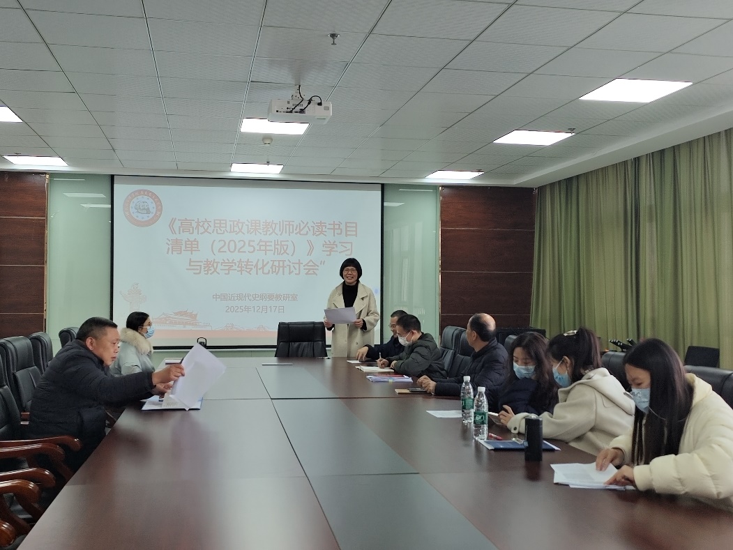 为深入学习贯彻教育部《高校思政课教师必读书目清单(2025年版)》精神,切实提升思想政治理论课的思想性、理论性和亲和力、针对性,2025年12月17日下午,“深读经典,赋能教学”——《高校思政课教师必读书目清单(2025年版)》学习与教学转化专题研讨会在行政楼802会议室成功举行。本次研讨会由“中国近现代史纲要”教研室主办,教研室主任吕翠华主持,教研室全体教师齐聚一堂,进行了一场聚焦理论深耕与教学创新的思想碰撞。
