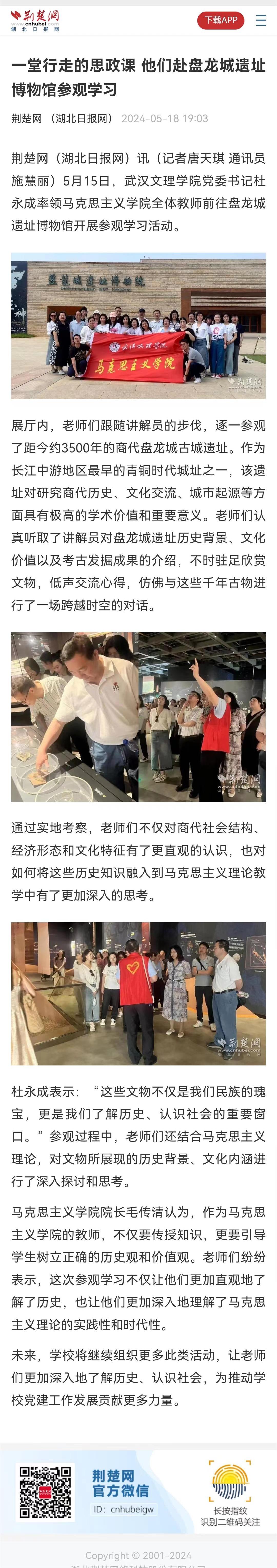 5月15日,武汉文理公司党委书记杜永成率领永利3044noc全体教师前往盘龙城遗址博物馆开展参观学习活动。荆楚网(湖北日报网)、中国教育在线等媒体进行报道。以下为相关报道内容。